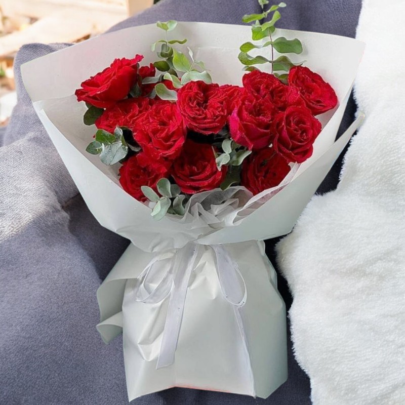 ช่อดอกกุหลาบแดง 12 ดอก แซมใบยูคา ห่อโทนสีขาว โบว์ขาว อย่างสวยงาม(โทน